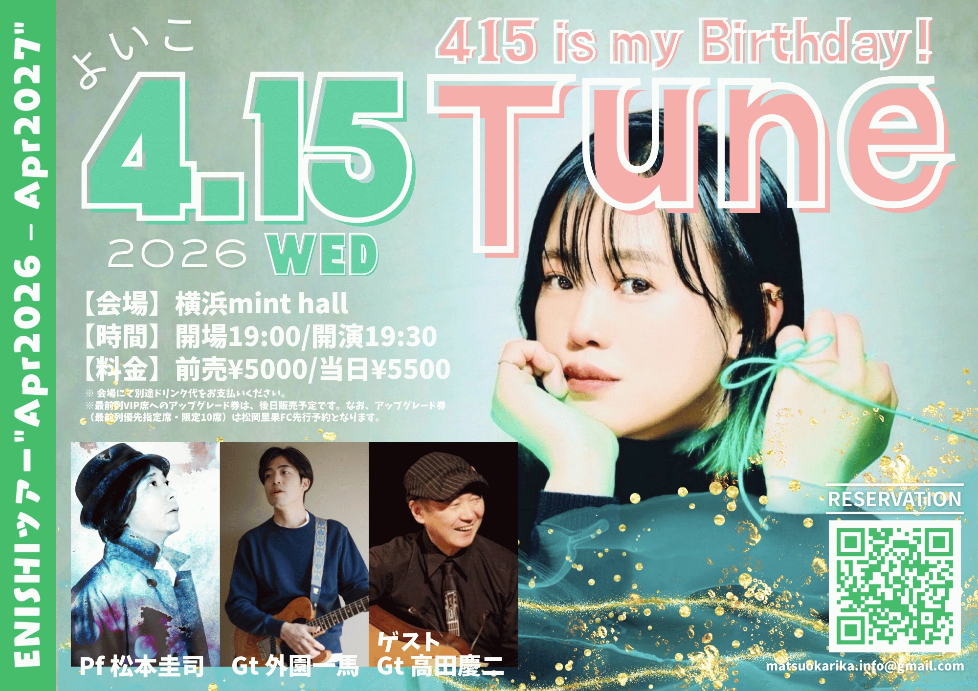 [1] 松岡里果の50人以上の単独公演時の先行予約や優先席などの特典が受けられます。